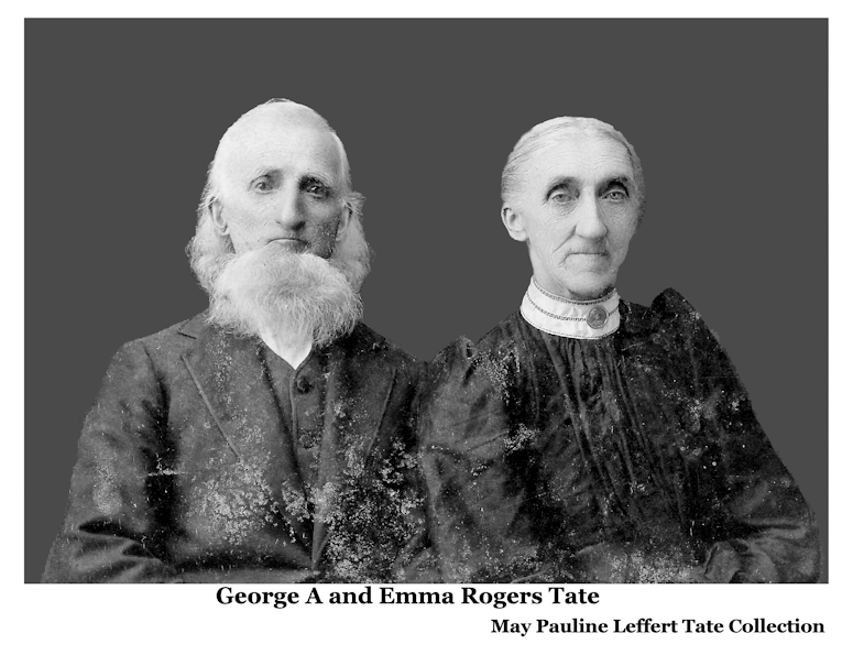 The 1900 Federal census lists George A., age 76, father of the Head of Household, (Joseph F. Tate, age 25), and Emma F, mother, age 57, as having no listed occupation. Also in the home that year was Amanda, wife of Joseph F, age 23, daughters, Rosa Lee, age 5, and Maggie M., age 1, and Rexford Tate, a nephew, age 10, born in Illinois, of parents who were born in Missouri. These may be of the Tate families located around Laclede, Illinois, where Fred and his young family had first lived.